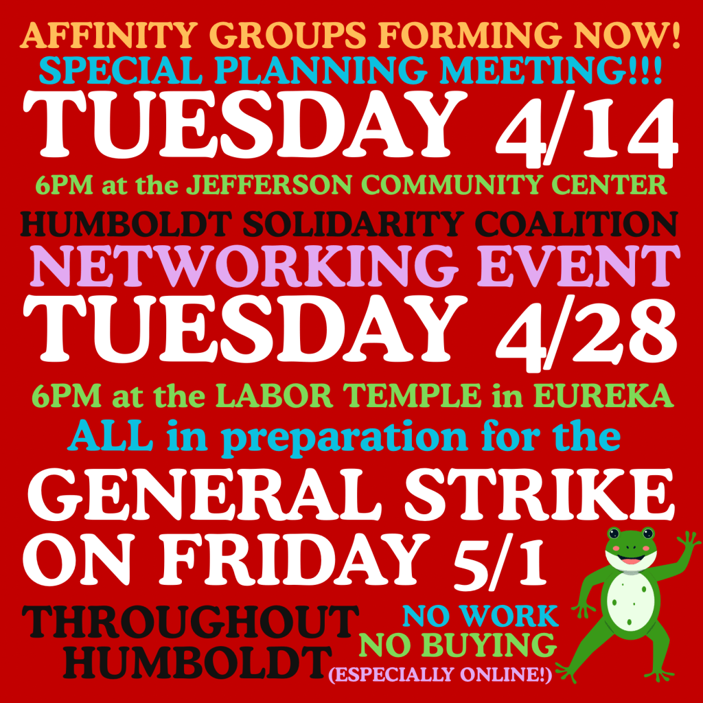 Fourth Tuesdays of the month at 6pm — Humboldt Solidarity Coalition’s Networking Event at the Labor Temple at 840 E Street in Eureka. Solomon co-hosts with Elle Penner. Learn more at humboldtsolidaritycoalition.wordpress.com